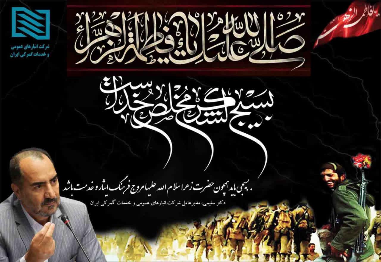 اینجانب ضمن عرض تسلیت سالروز شهادت دخت نبی مکرم اسلام ، همسر معظم امیرالمومنین علــی علیــه الســلام حضرت صدیقه طاهره ، فاطمه الزهرا سلام الله علیها ، قرار داشتن در هفته بسیج، این یادگار جاوید حضرت امام خمینی(ره)، را به بسیجیان آزاده و ایثارگر، بهخصوص بسیجیان خدوم خانواده بزرگ شرکت انبارهای عمومی و خدمات گمرکی ایران گرامی میدارم و از خداوند متعال سربلندی ایران اسلامی و توفیقات روزافزون تمام همکاران گرامی را ضل توجهات حضرت ولیعصر(عجل الله تعالی فرجه الشریف) و در پرتو منویات رهبر معظم انقلاب (مدظلهالعالی) مسئلت دارم.